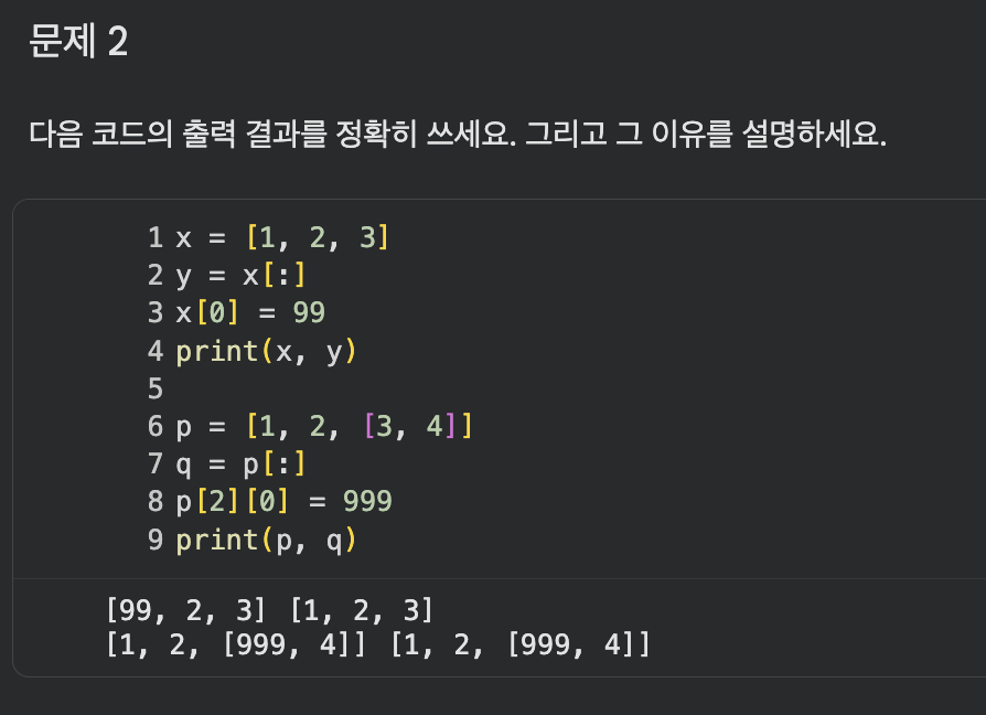 a = [1, 2, 3]b = a[:]a[0] = 99print(a, b) # ์๋ก ๋ค๋ฅด๊ฒ ๋์จ๋คp = [1, 2, [3, 4]]q = p[:]p[2][0] = 999print(p, q) # ๋ ๋ค ๊ฐ์ด ๋ฐ๋๋ค๋ ์ฝ๋ ๋ชจ๋ ์ฌ๋ผ์ด์ฑ([:])์ผ๋ก ๋ณต์ฌํ๋๋ฐ, ์ ๊ฒฐ๊ณผ๋ ์์ ํ ๋ค๋ฅผ๊น?์ด ๊ธ์์๋