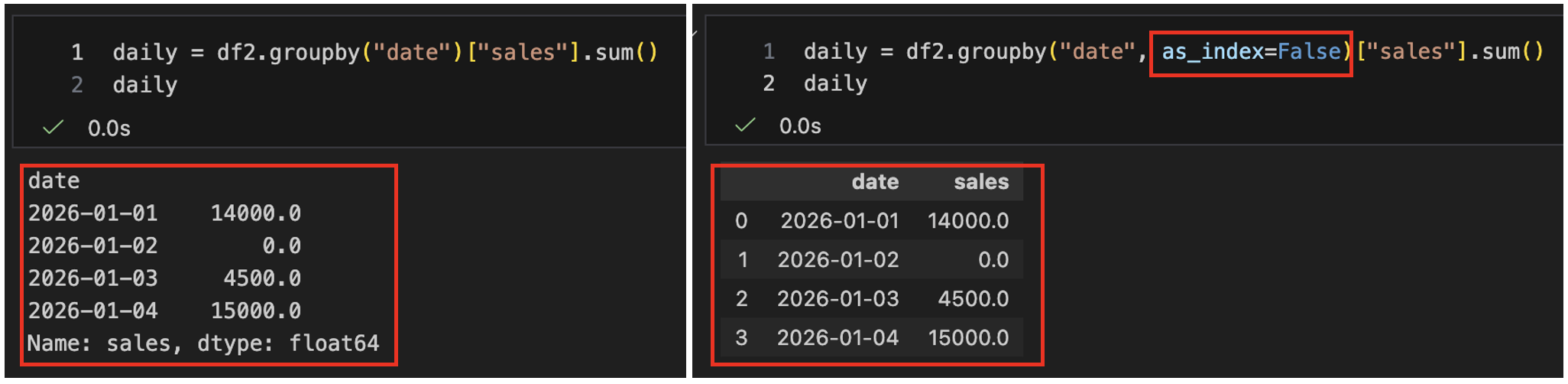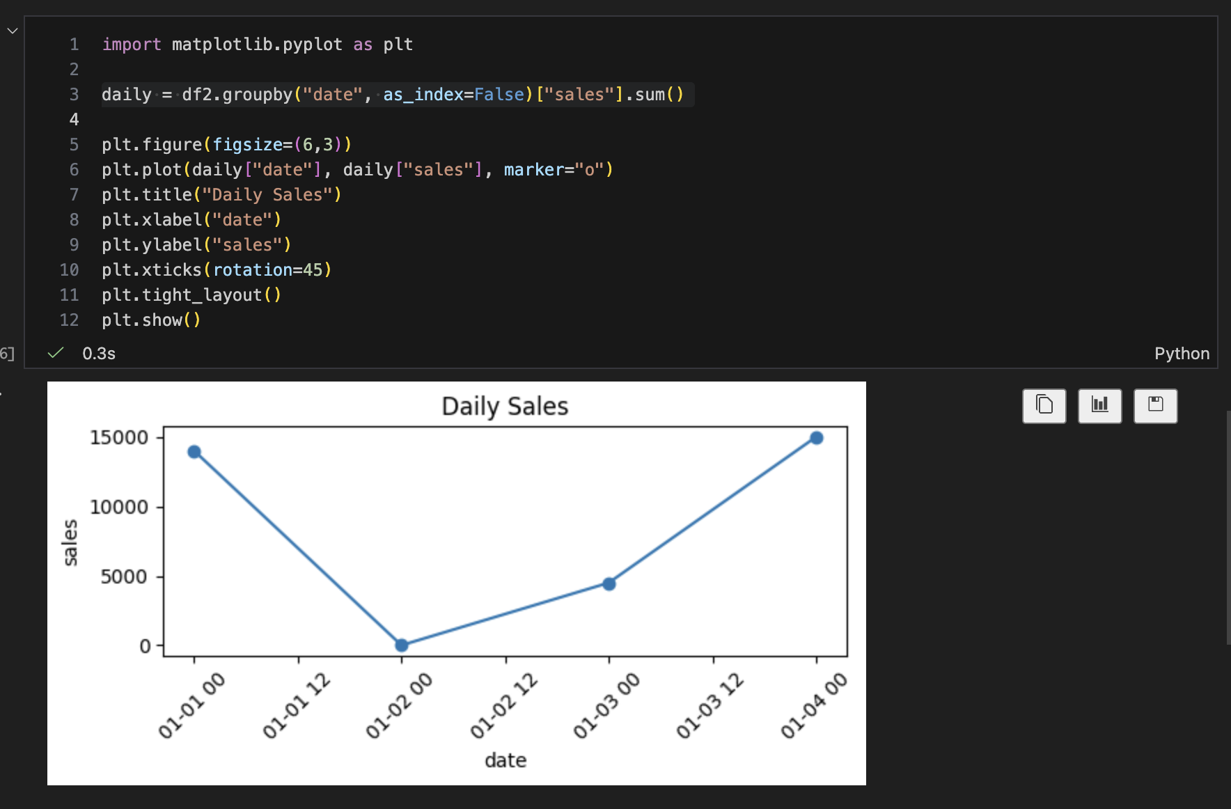 - daily = df2.groupby("date", as_index=False)["sales"].sum()