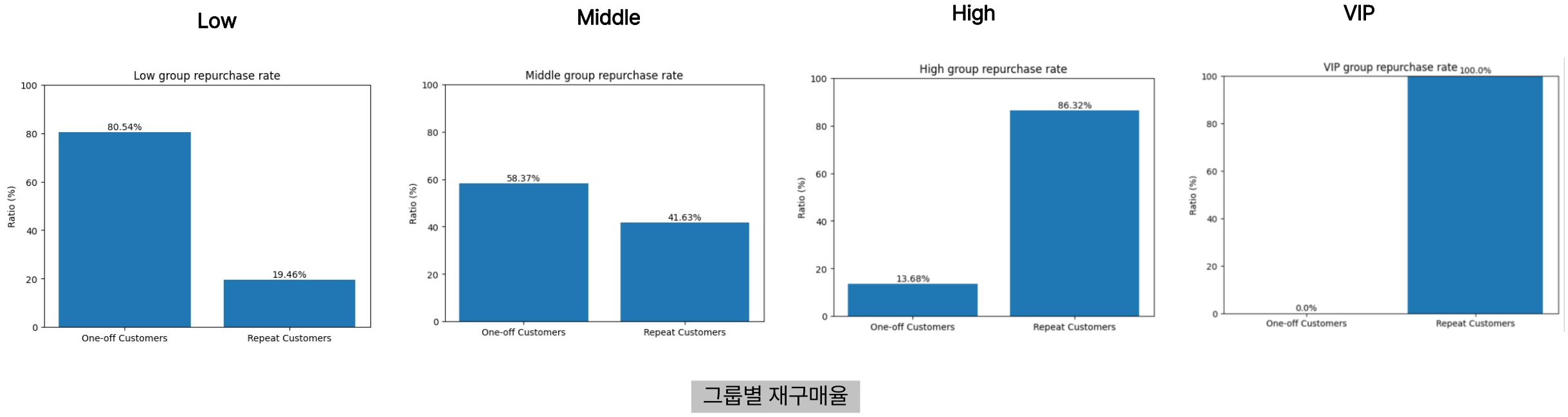 low, middle, high, vip ๋ค ๊ฐ์ ๊ทธ๋ฃน์ผ๋ก ๋๋์ด ๊ฐ ๊ณ ๊ฐ์ธต์ ๊ตฌ๋งค ๊ฒฝํฅ์ ํ์ , ๊ทธ์ ๋ง๋ ์ฅ๊ธฐ์ ํ๋ก๋ชจ์ ๋ฐฉํฅ ์ ์. - ๊ณ ๊ฐ ์ถฉ์ฑ๋ ์งํ: